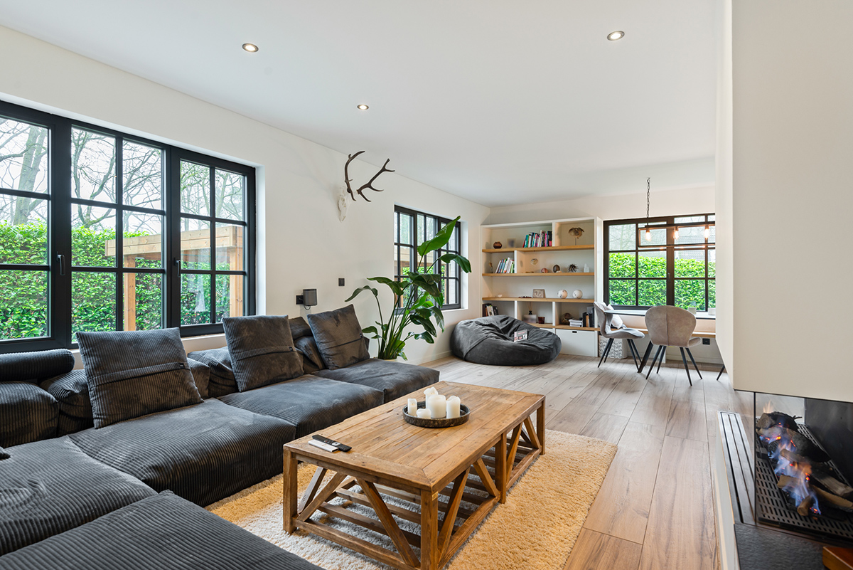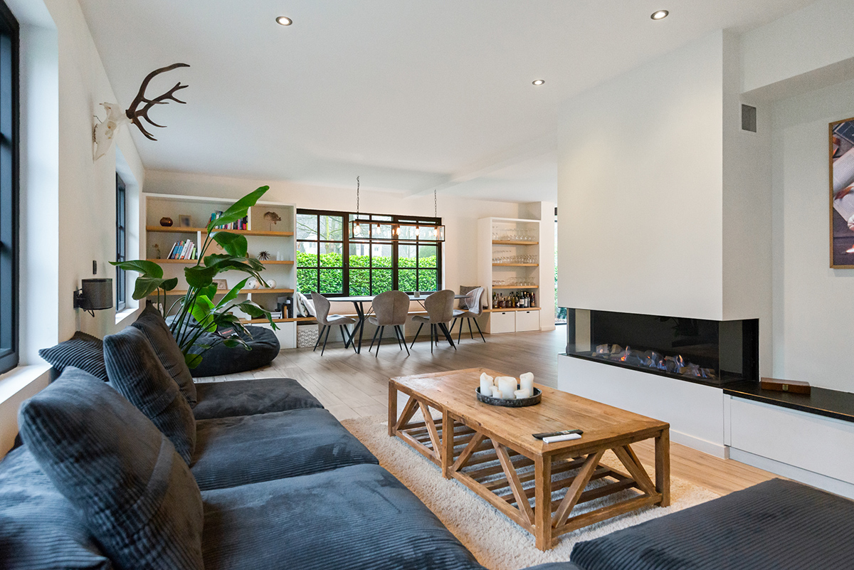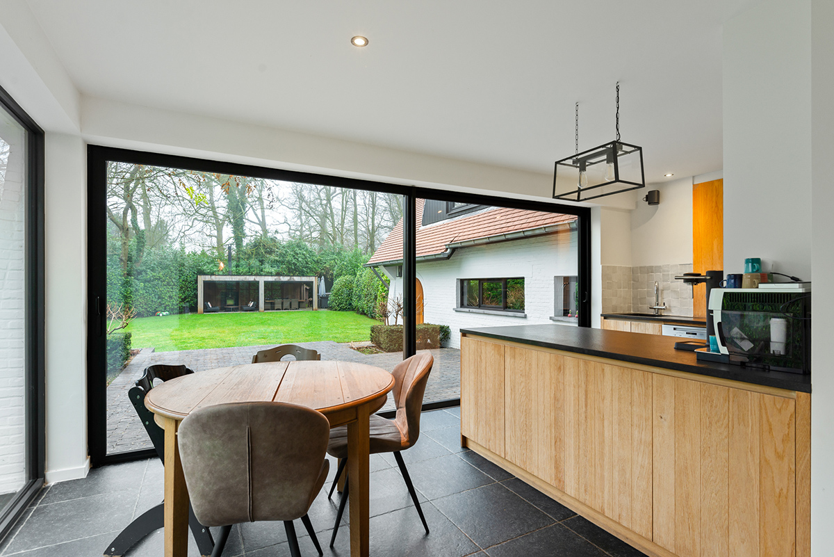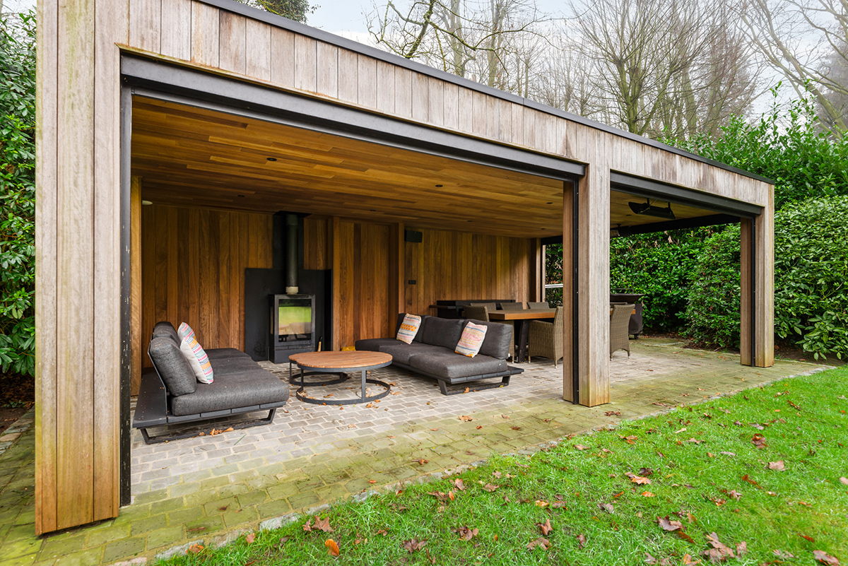 Aan de woning bevindt zich een ruim terras en achteraan in de tuin, zuidwest georiënteerd, vinden we ook nog een prachtige, volledig uitgeruste overkapping. Alle troeven voor gezellige avonden, waaronder een houthaard, zijn hier aanwezig.