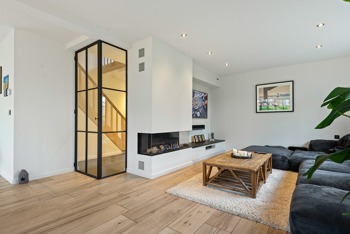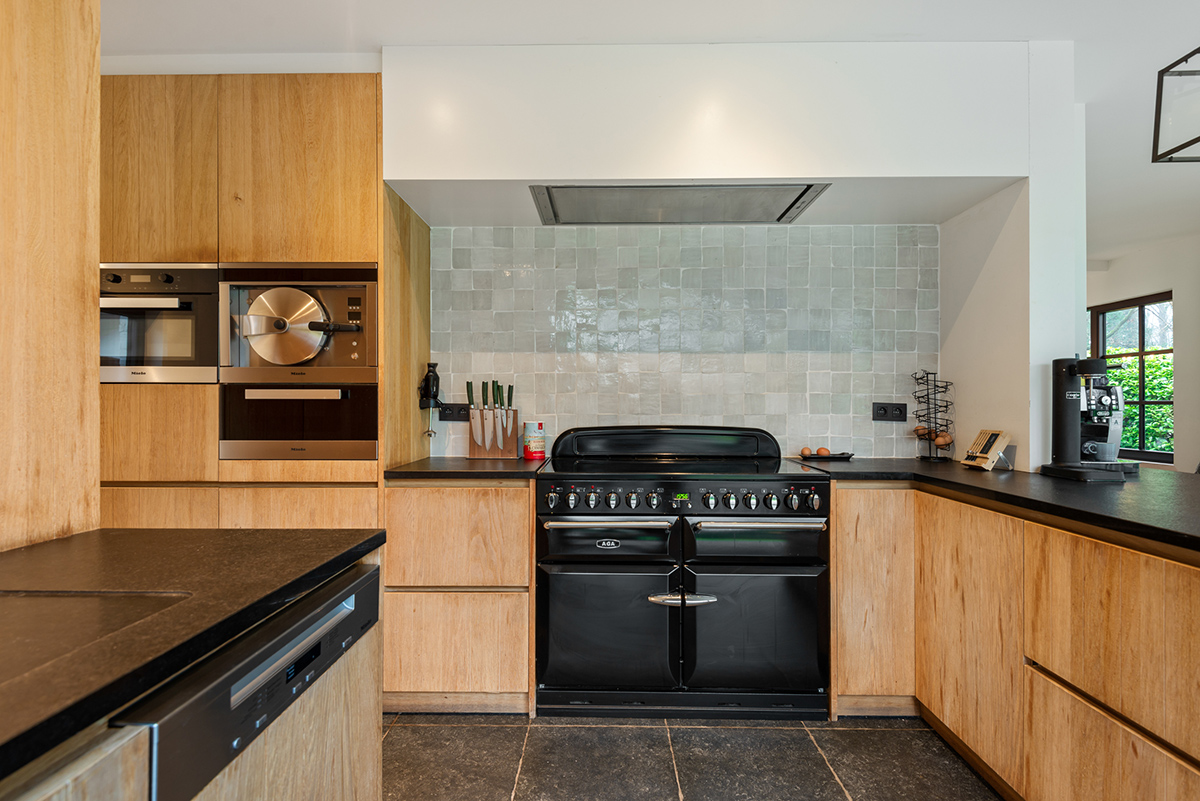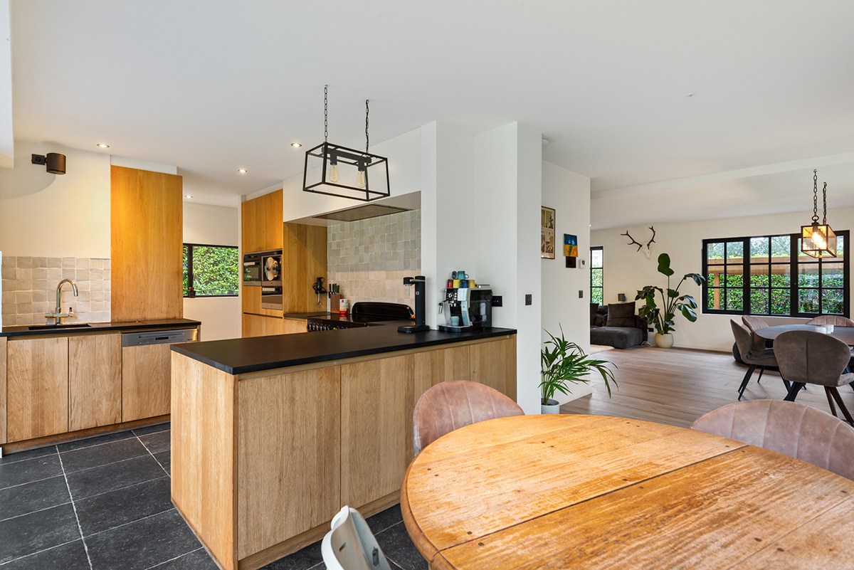 We betreden de woning langs de ruime inkomhal (met gastentoilet), welke ons toegang geeft tot de kelder, de lichtrijke leefruimte (met gashaard), de volledig uitgeruste keuken en de garage (met ook de voorzieningen voor wasmachine en droogkast). De kwalitatieve keuken is uitgerust met voldoende kast- en werkbladruimte en de volgende toestellen: AGA Masterchef (met inductiekookplaat), dampkap, microgolfoven, stoomoven, warmhoudlade, spoelbak, vaatwasser en koelkast!
