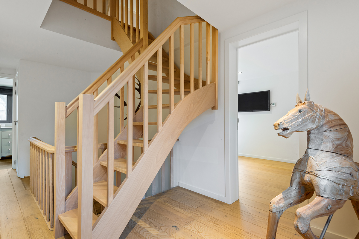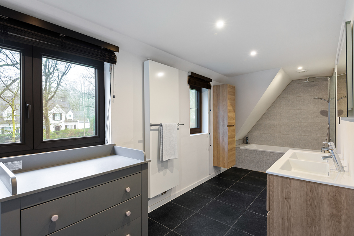 Op de eerste verdieping vinden we drie ruime slaapkamers, waaronder een leuke master met en suite badkamer (met dubbele lavabo, inloopdouche en bad) en dressing. Daarnaast vinden we op de eerste verdieping ook nog een tweede badkamer (met dubbele lavabo en ligbad met douchevoorziening) en een apart toilet terug.