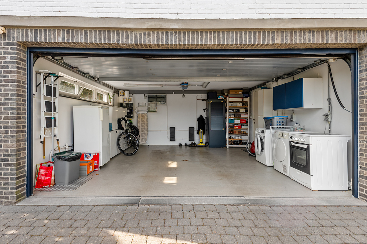 Zoals hoger al aangegeven beschikt de woning over een ruime garage met sectionaal poort (geautomatiseerd). Hier vinden we ook de voorzieningen voor wasmachine en droogkast terug. Niet alleen in de garage kan de wagen gestald worden, ook de oprit biedt plaats aan meerdere wagens.